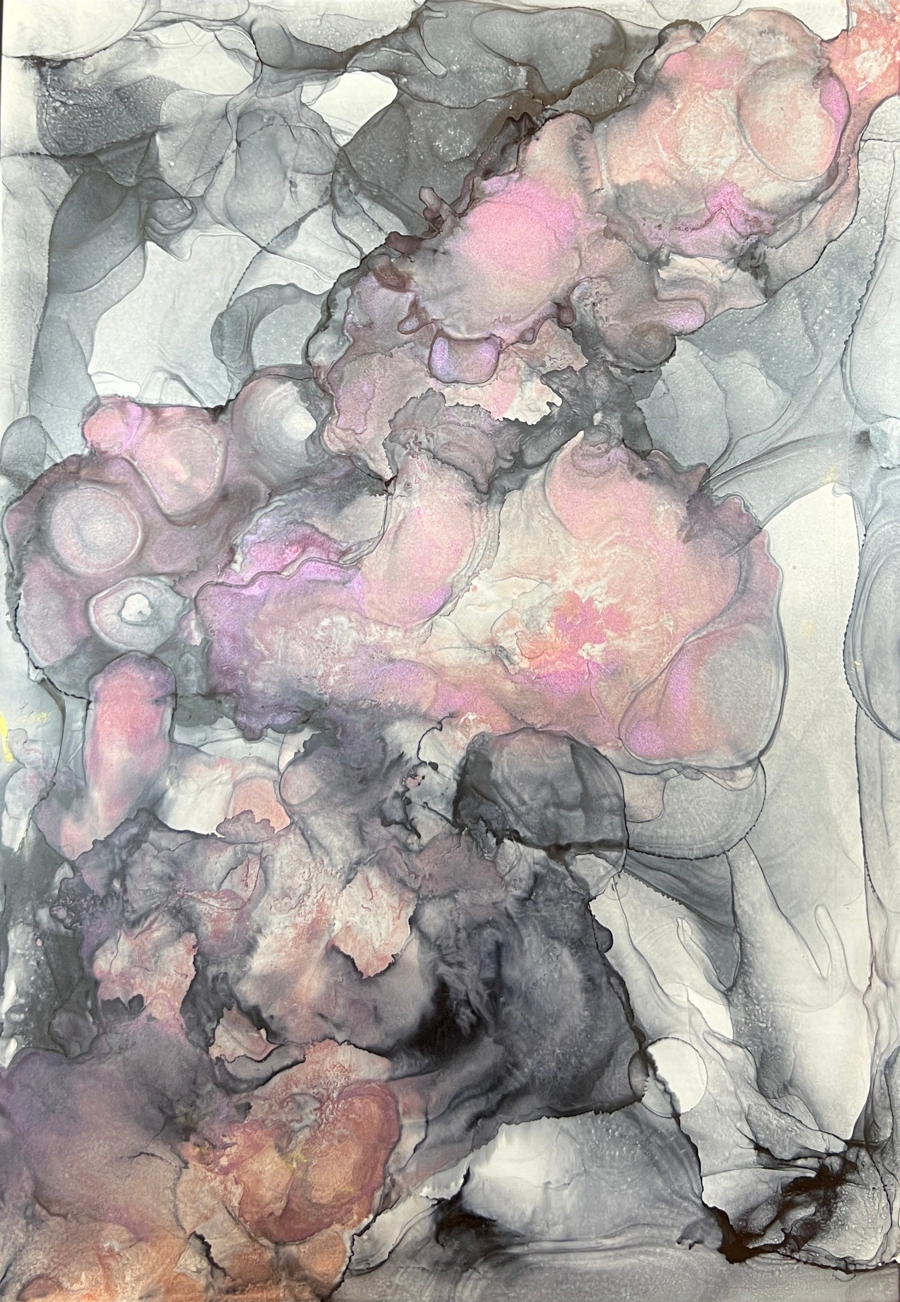 This alcohol ink on yupo paper artwork presents a moody and ethereal composition, with soft washes of gray, black, and pink blending together in organic forms. The ink flows seamlessly across the surface, creating swirling patterns and delicate textures that evoke a sense of depth and mystery. The muted palette of smoky grays is contrasted by subtle hints of iridescent pinks and purples, which shimmer gently, adding a luminous quality to the piece. The composition feels both fluid and atmospheric, reminiscent of mist or clouds, with darker areas grounding the lighter, more translucent spaces. The use of yupo paper enhances the fluidity of the inks, giving the painting a glossy, almost dreamlike finish. The overall effect is calming and introspective, drawing the viewer into its abstract, flowing forms.