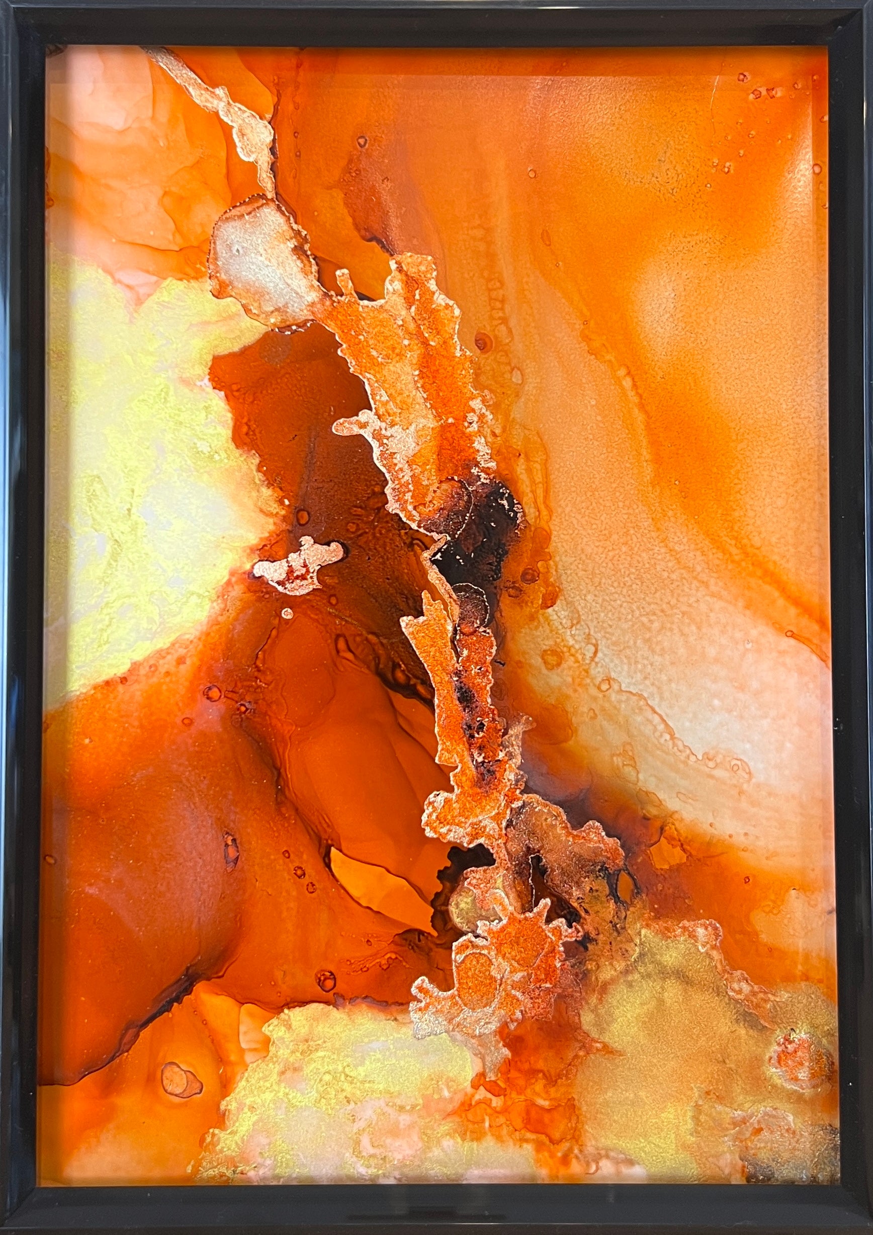 This vibrant alcohol ink on yupo paper artwork radiates with intense shades of orange, amber, and gold, creating a dynamic, fiery composition. The fluidity of the ink produces organic, flowing forms that seem to shift and move across the surface. Rich rust and brown tones emerge in the center, accented by intricate, crystalline edges that add texture and depth to the piece. The bold use of color evokes images of molten lava or the warmth of a glowing sunset, while the lighter, almost translucent areas provide balance and contrast. The glossy yupo paper enhances the luminosity of the inks, giving the painting a radiant, almost glowing quality.