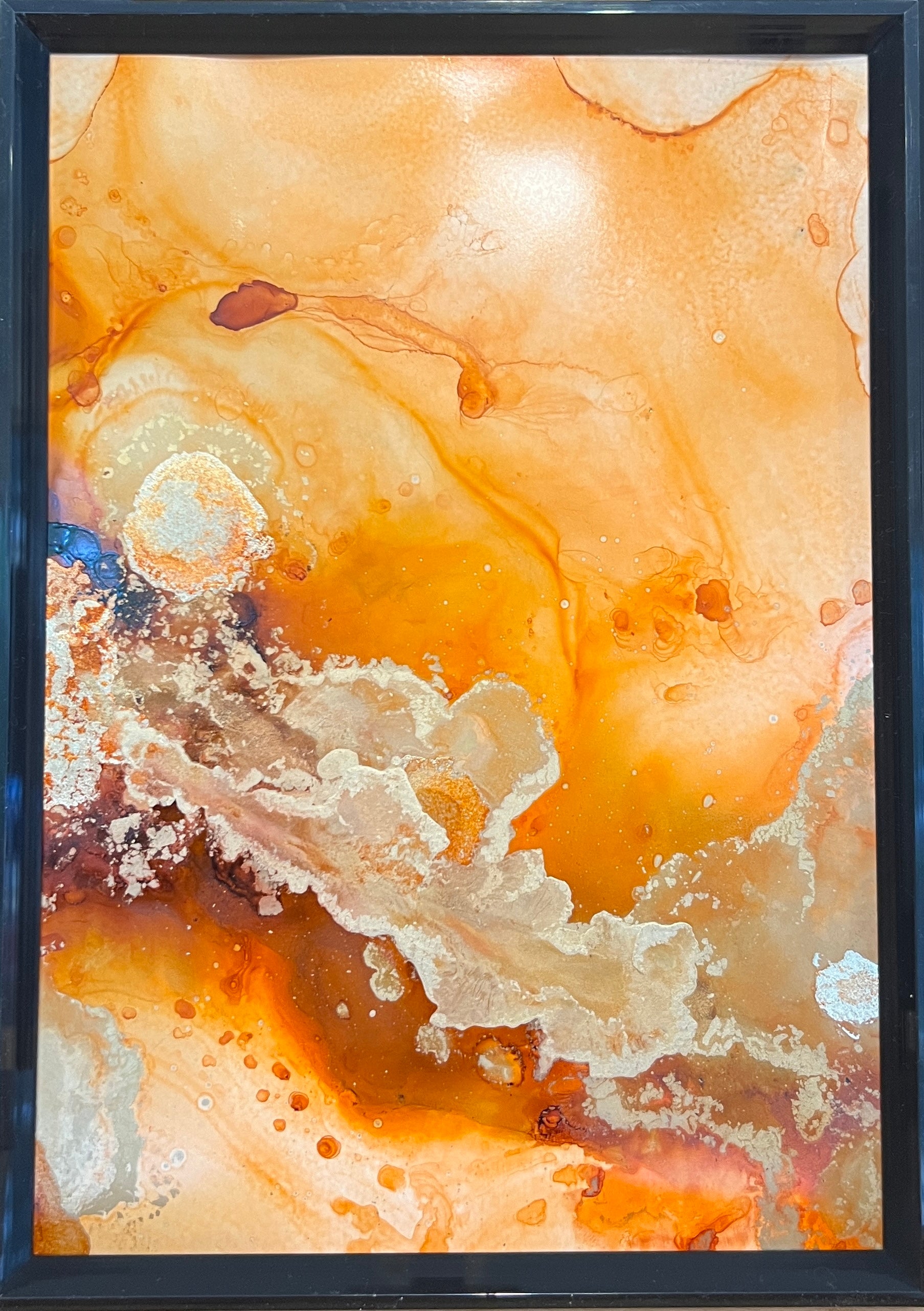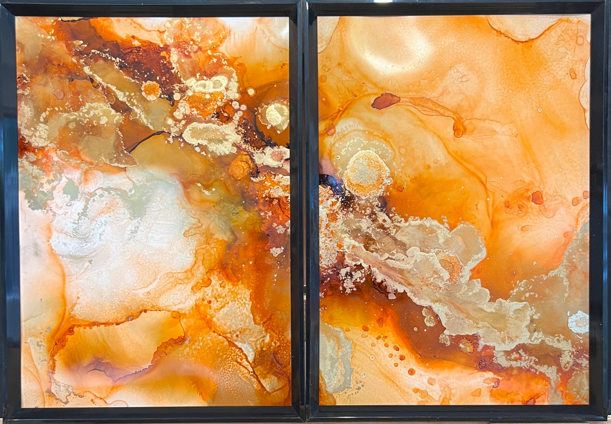 This striking diptych of alcohol ink on yupo paper is a vibrant fusion of warm, earthy tones that flow seamlessly across both panels, creating a unified and dynamic composition. Rich shades of burnt orange, amber, and ochre dominate the artwork, with delicate, organic patterns emerging from the interplay of color and texture. Swirls of gold shimmer throughout, adding a sense of depth and movement, while softer beige and cream tones provide contrast and balance. The fluid, almost molten quality of the ink creates the impression of a geological or cosmic event—like the surface of a distant planet or the dynamic flow of lava. The two panels complement each other, with each side echoing the shapes and colors of the other, forming a cohesive visual narrative that draws the viewer's eye across both pieces. The glossy finish of the yupo paper enhances the vibrancy of the inks, giving the artwork an intense, luminous quality.
